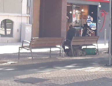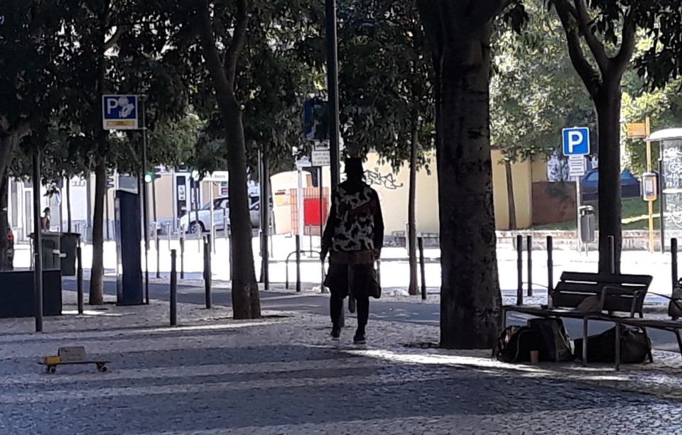 Talvez pertençam ao grupo dos sem-abrigo de Lisboa. Os seus pertences guardados em sacos por baixo do banco de rua onde se sentam enquanto não fazem os seus malabarismos. Estrangeiros. Pedem para “comida e bebida”. O que os terá trazido a Portugal? O que os levou a viver na rua?